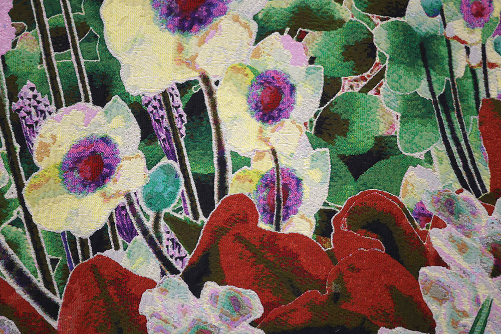 The tapestry transforms the world to the scale of the insect. Flowers are blown up so we are shrunk to the scale of pollinators. Colours are skewed with Ginsberg’s ‘pollinator vision’ filter, which demonstrates a different way of seeing, and her imagery is scarred with computational distortions hinting at the otherworldliness of another species’ experience. The history of tapestry as a utopian space is blended with a utopian vision of a garden, first and foremost as art for the more-than-human rather than a place for humans.