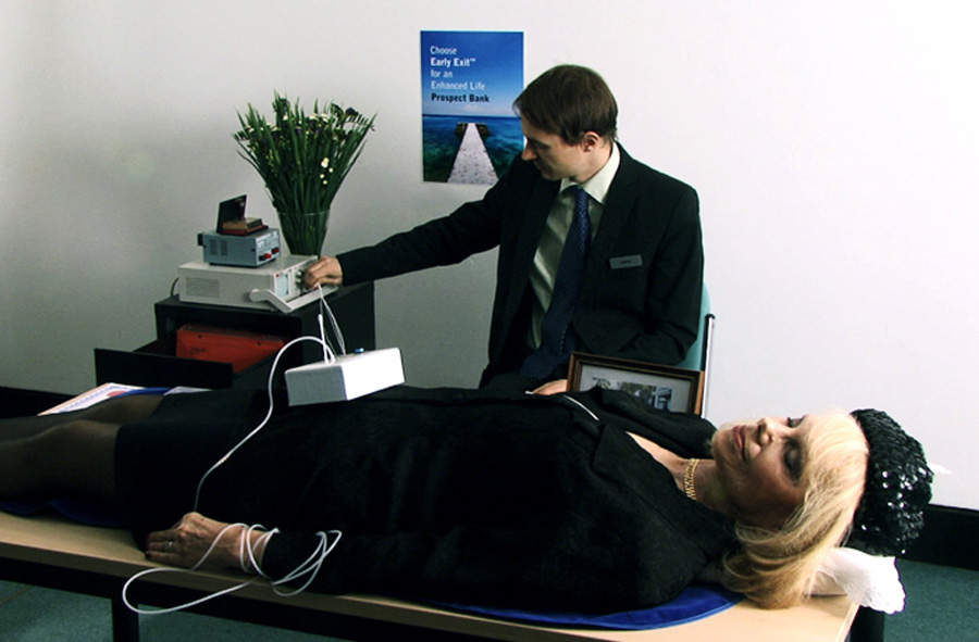 Would you trade Alzheimer’s for breast augmentation or a luxury cruise? With an ageing population and an overextended NHS, you may find yourself alone, geriatric and diseased in your home, discovering new forms of ‘Care in the Community,’ ordering your food by rescanning barcodes on empty tins of Spam and using a webcam to be diagnosed by your GP. So why not choose a cash windfall and a shorter life? Post Credit Crunch, ‘Genetic Credit’ could give us unprecedented purchasing power. Gamble on your risky future, and opt for an ‘Early Exit.’ You would eliminate the risk of inherited disease and receive a refund for all the healthcare expenses you might otherwise have run up.