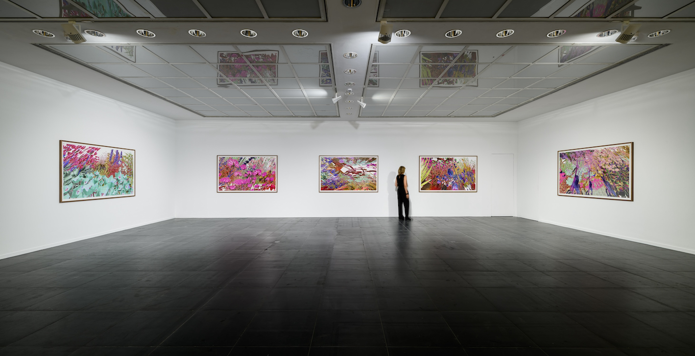 For ‘Bending the Curve’, the five large-scale prints were generated from unrealised planting schemes, none of which depict the human perspective. Ginsberg digitally paints each plant that appears in her ‘Plant Palettes’, making it possible to visualise each potential living artwork in a virtual space before it is planted. Ginsberg has flown through the digital gardens and chosen the viewpoint of pollinators, from a low flight or ground angle.