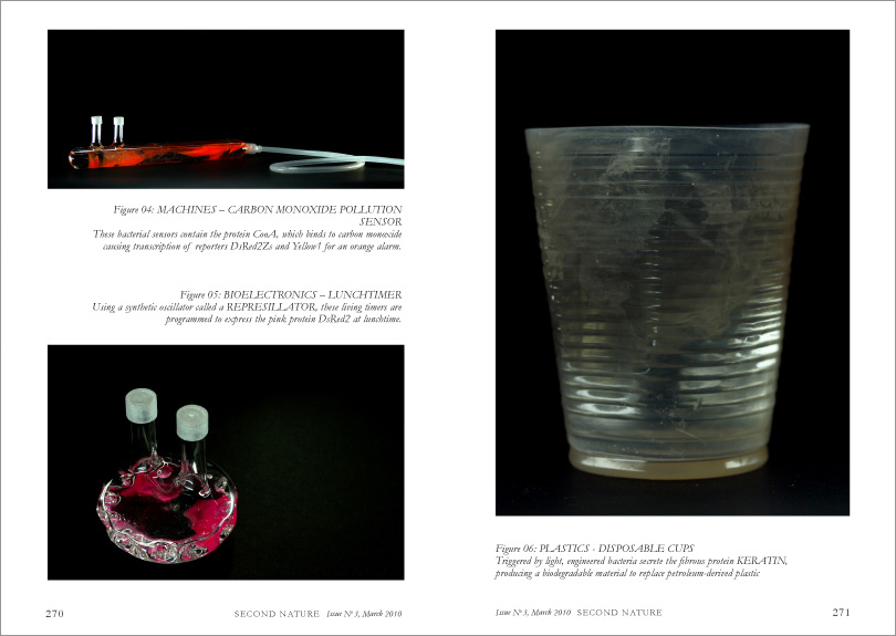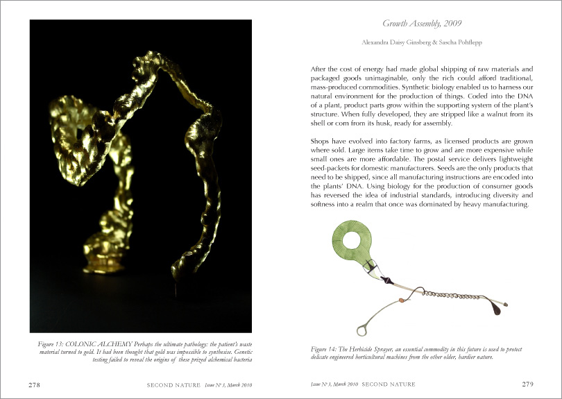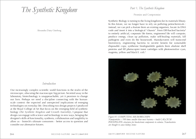 Our increasingly complex scientific world functions in the realm of the microscopic, obscuring the macroscopic big picture. Secreted away in the laboratory, biotechnology is unapproachable, yet it promises to change our lives. Perhaps we need a discipline connecting with the human- scale context: the expected and unexpected implications of emerging technologies on everyday life. Describing two design projects I produced at the Royal College of Art that focus on the emerging field of synthetic biology (The Synthetic Kingdom and Growth Assembly), I propose that design can engage with science and technology in new ways, bringing the designer’s skills of functionality, synthesis, collaboration and tangibility to allow us—biotech’s ultimate consumers—better access to question and consider our alternative futures.