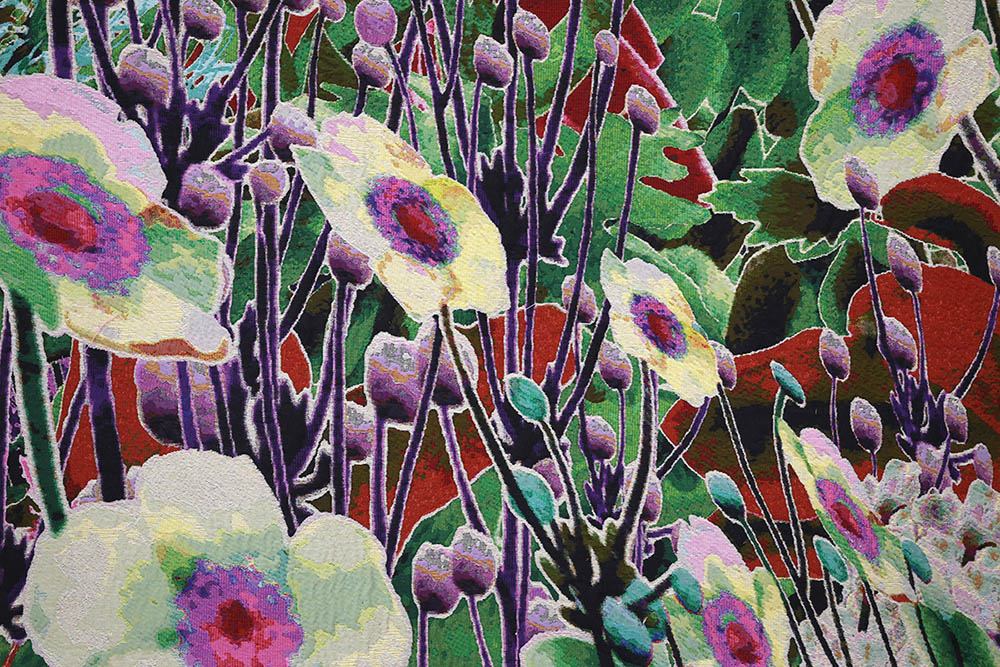The tapestry transforms the world to the scale of the insect. Flowers are blown up so we are shrunk to the scale of pollinators. Colours are skewed with Ginsberg’s ‘pollinator vision’ filter, which demonstrates a different way of seeing, and her imagery is scarred with computational distortions hinting at the otherworldliness of another species’ experience. The history of tapestry as a utopian space is blended with a utopian vision of a garden, first and foremost as art for the more-than-human rather than a place for humans.