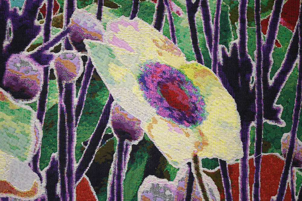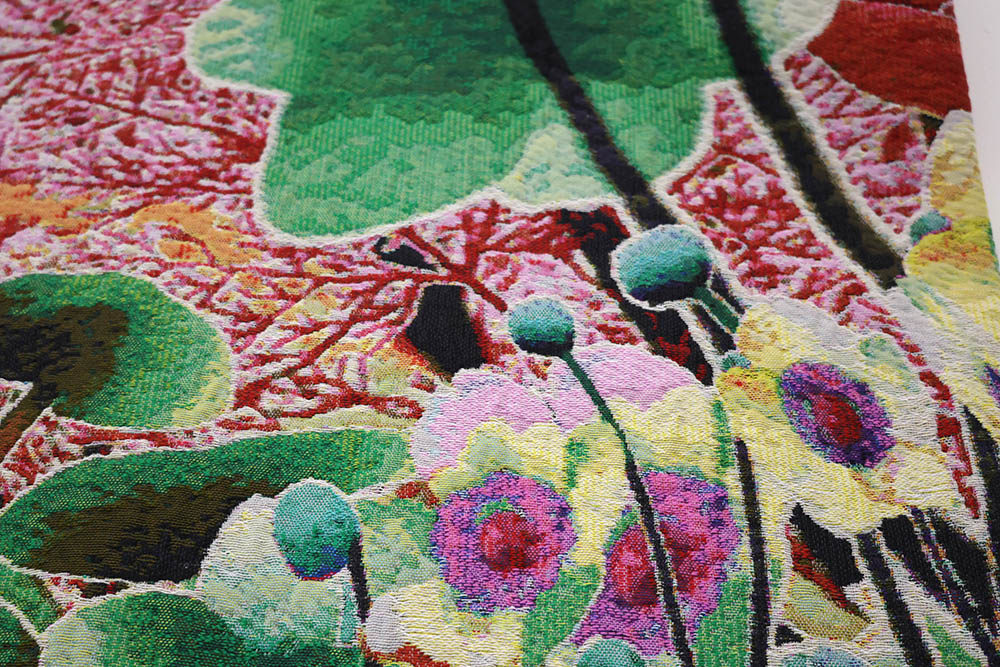 The tapestry depicts an unrealised edition of Ginsberg’s Pollinator Pathmaker, a living artwork that must be planted to exist. Ginsberg generates a digital garden using her algorithmic generation software, capturing different aspects and seasons from digital fly-throughs of each garden, which is then translated into the unique composition of each tapestry.