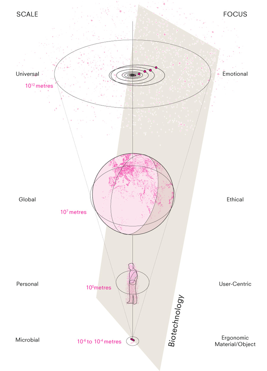 This was a starting point for my Royal College of Art dissertation, which used the microbe as a guide through the different scales of biotech, from microscopic molecular interactions to the vastness of outer space. I explored how design might evolve in the future: while designers may indeed forecast and design new biotech applications, we need a discipline to work between ethics and science, engaging with both the expected and unexpected consequences of technology. Who does this big picture view belong to? An increasingly complex scientific world obscures the macroscopic. Can design claim it, bringing the skills of synthesis, collaboration and tangibility to allow us to address the future?