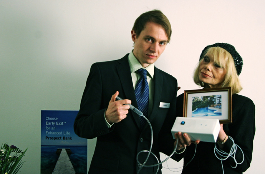 A short film explores euthanasia as financial service and the psychological effects of knowing your genetic future. Would knowing the risks ahead make it easier to trade a portion of your life for a cash refund? How would it feel to go to the bank for an appointment you made 45 years earlier? And what would you wear?