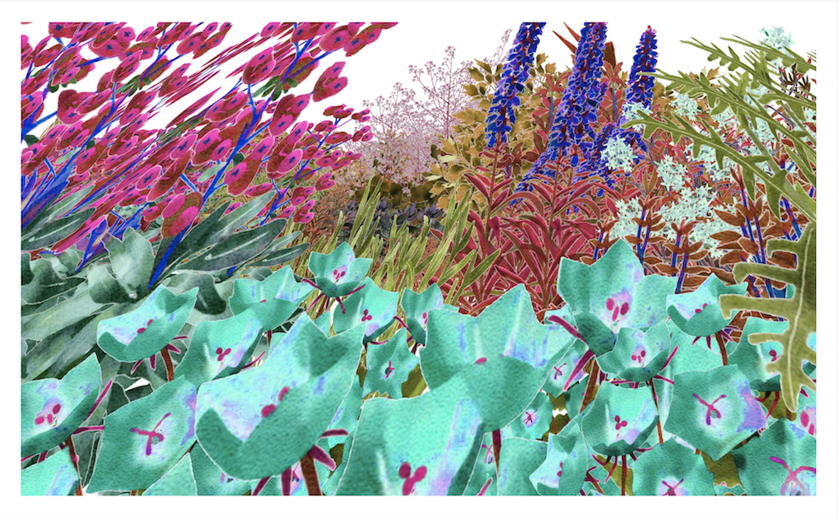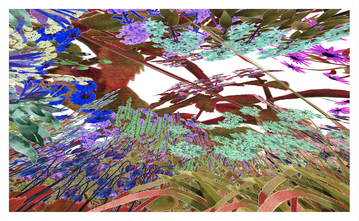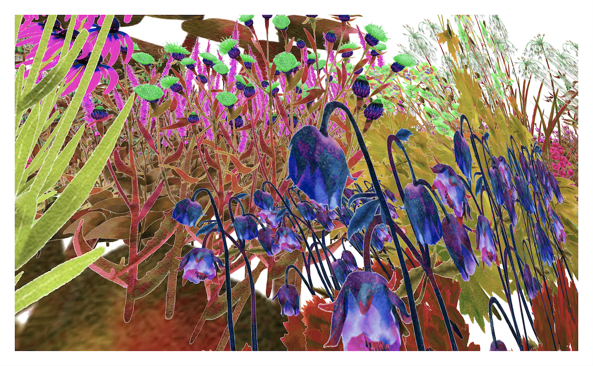 For ‘Bending the Curve’, the five large-scale prints were generated from unrealised planting schemes, none of which depict the human perspective. Ginsberg digitally paints each plant that appears in her ‘Plant Palettes’, making it possible to visualise each potential living artwork in a virtual space before it is planted. Ginsberg has flown through the digital gardens and chosen the viewpoint of pollinators, from a low flight or ground angle.