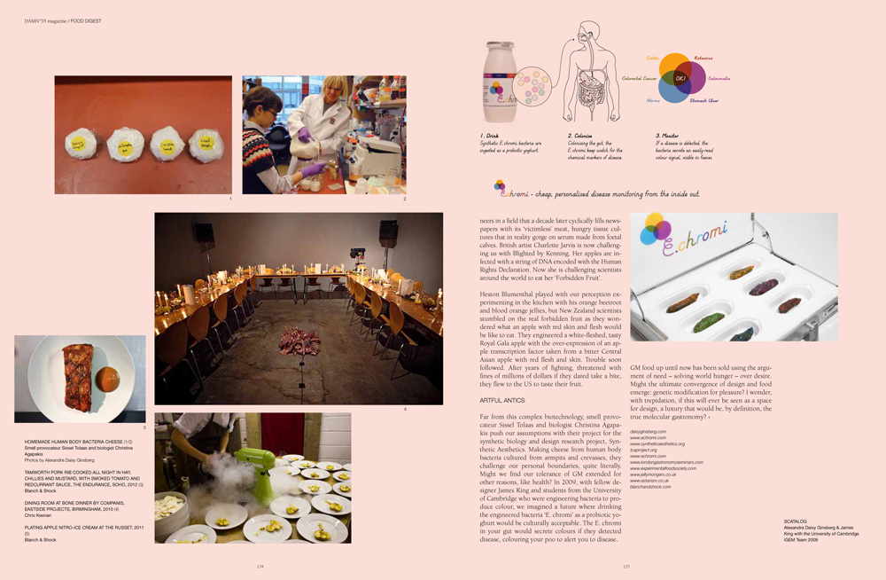 Far from this complex biotechnology, smell provocateur Sissel Tolaas and biologist Christina Agapakis push our assumptions with their project for the synthetic biology and design research project, Synthetic Aesthetics. Making cheese from human body bacteria cultured from armpits and crevasses, they challenge our personal boundaries, quite literally. Might we find our tolerance of GM extended for other reasons, like health? In 2009, with fellow designer James King and students from the University of Cambridge who were engineering bacteria to produce colour, we imagined a future where drinking the engineered bacteria ‘E. chromi’ as a probiotic yoghurt would be culturally acceptable. The E. chromi in your gut would secrete colours if they detected disease, colouring your poo to alert you to disease.